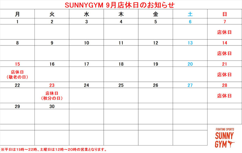 店休日のお知らせ · 20日 8月 2025 9月店休日のお知らせ いつもサニージムをご利用いただきありがとうございます。 9月店休日となります。 ご確認いただきお間違えの無いようお気を付けください。 tagPlaceholderカテゴリ: